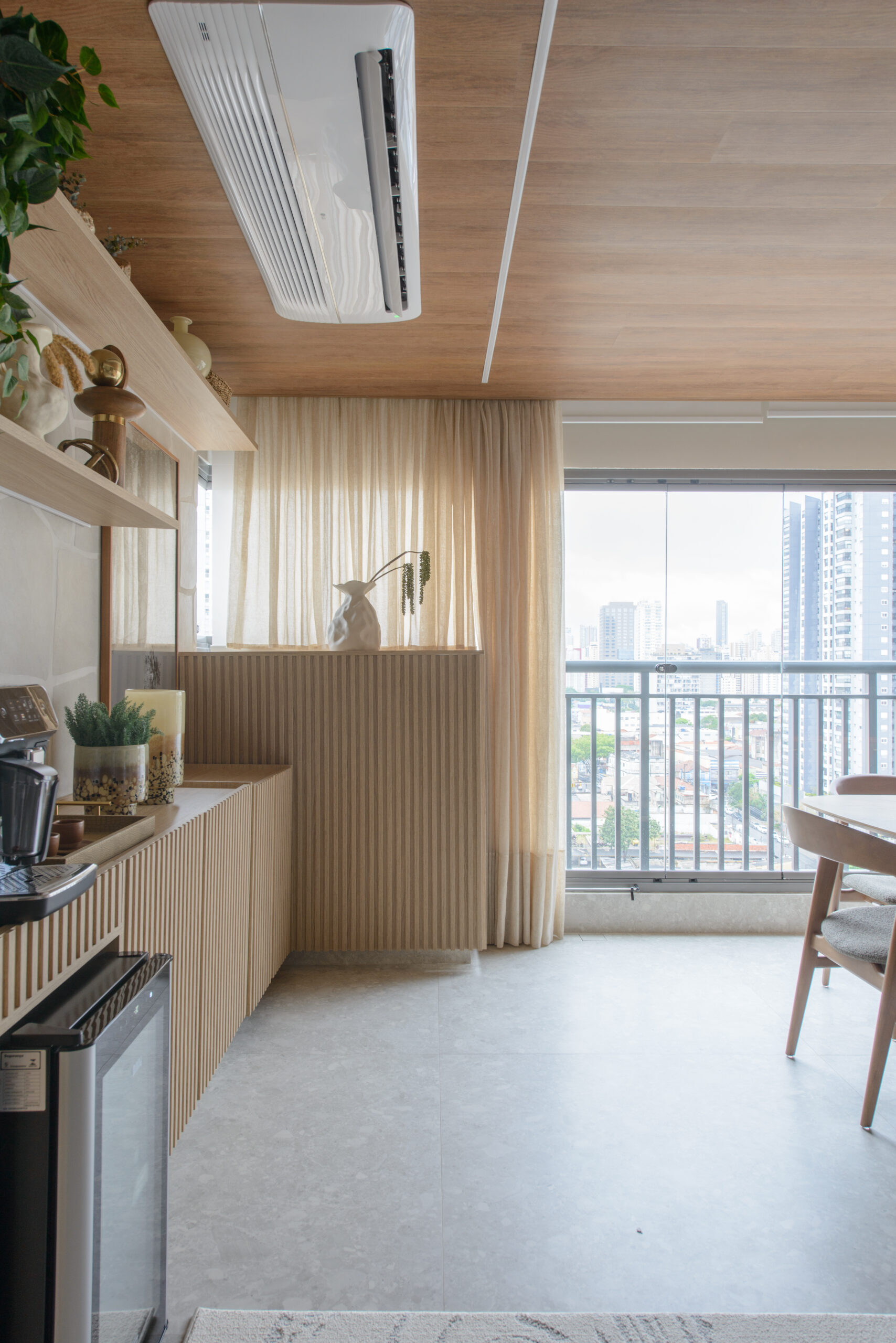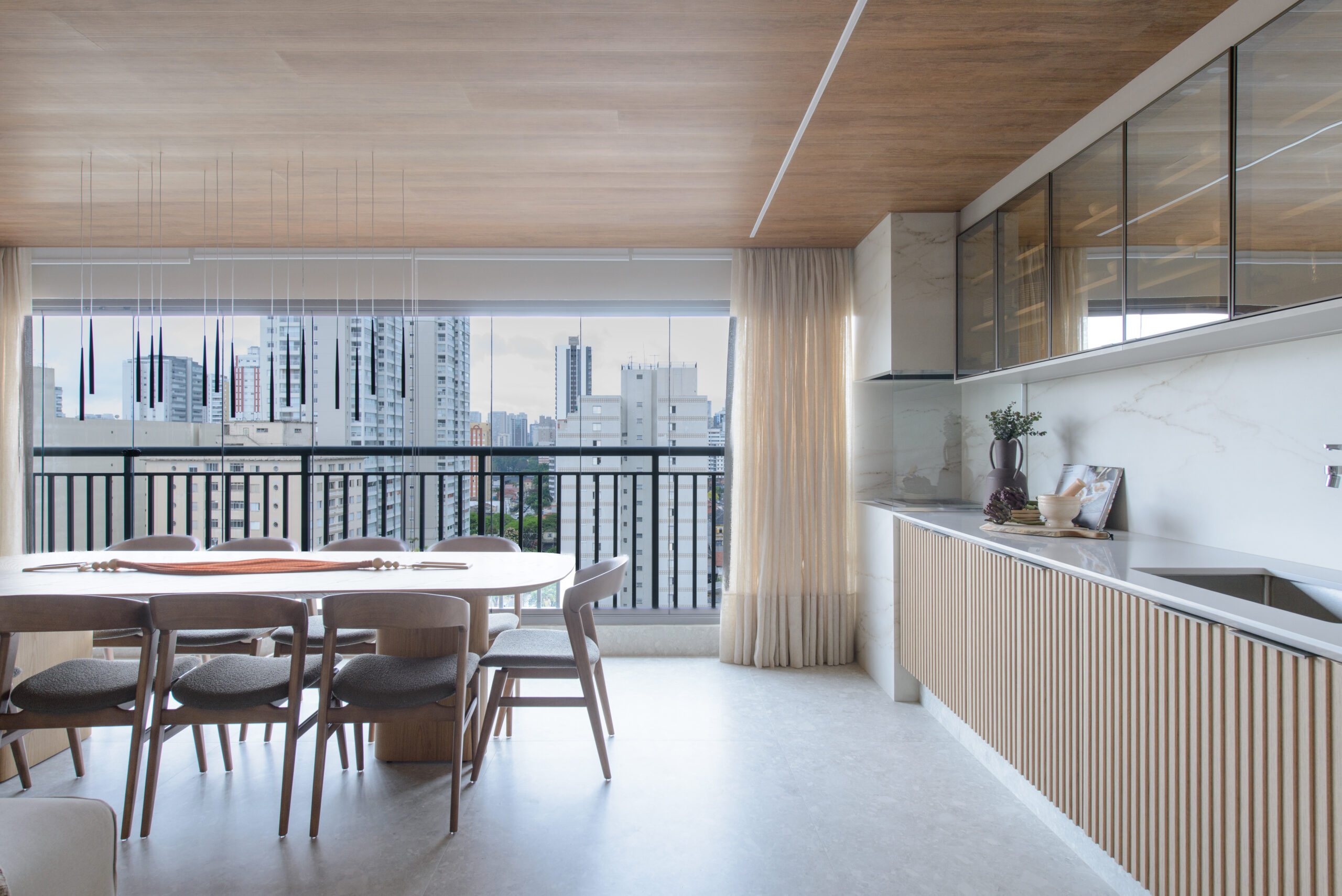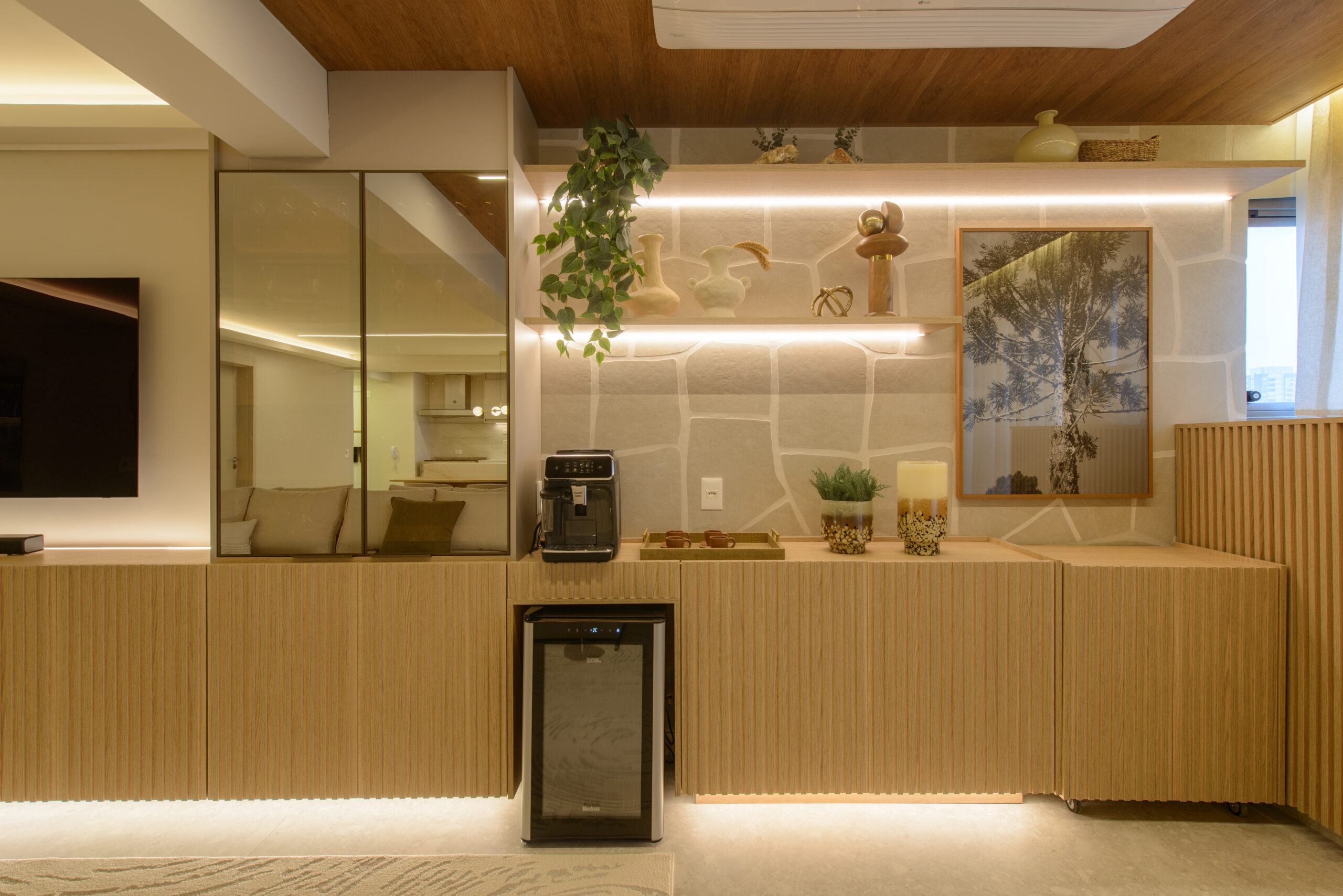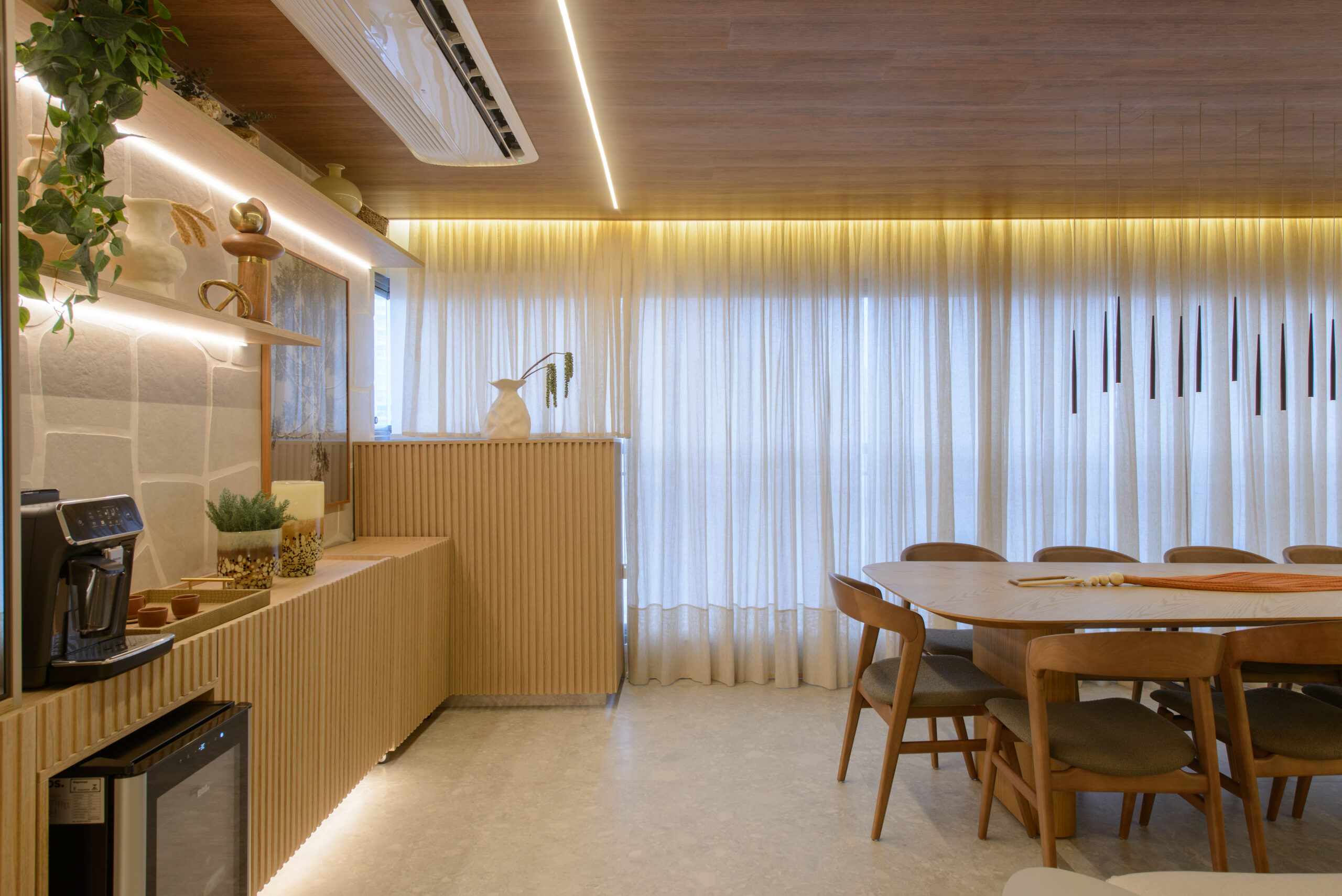 Atendendo aos pedidos especiais da cliente, o fogão italiano se destaca na cozinha, que foi projetada como o coração da casa, refletindo o amor dela por cozinhar e receber. A decoração combinou elementos clássicos com um toque contemporâneo brasileiro, resultando em um apartamento elegante, onde o marmorizado e os toques dourados se misturam harmoniosamente com elementos amadeirados e revestimentos orgânicos, trazendo leveza para dentro do ambiente.