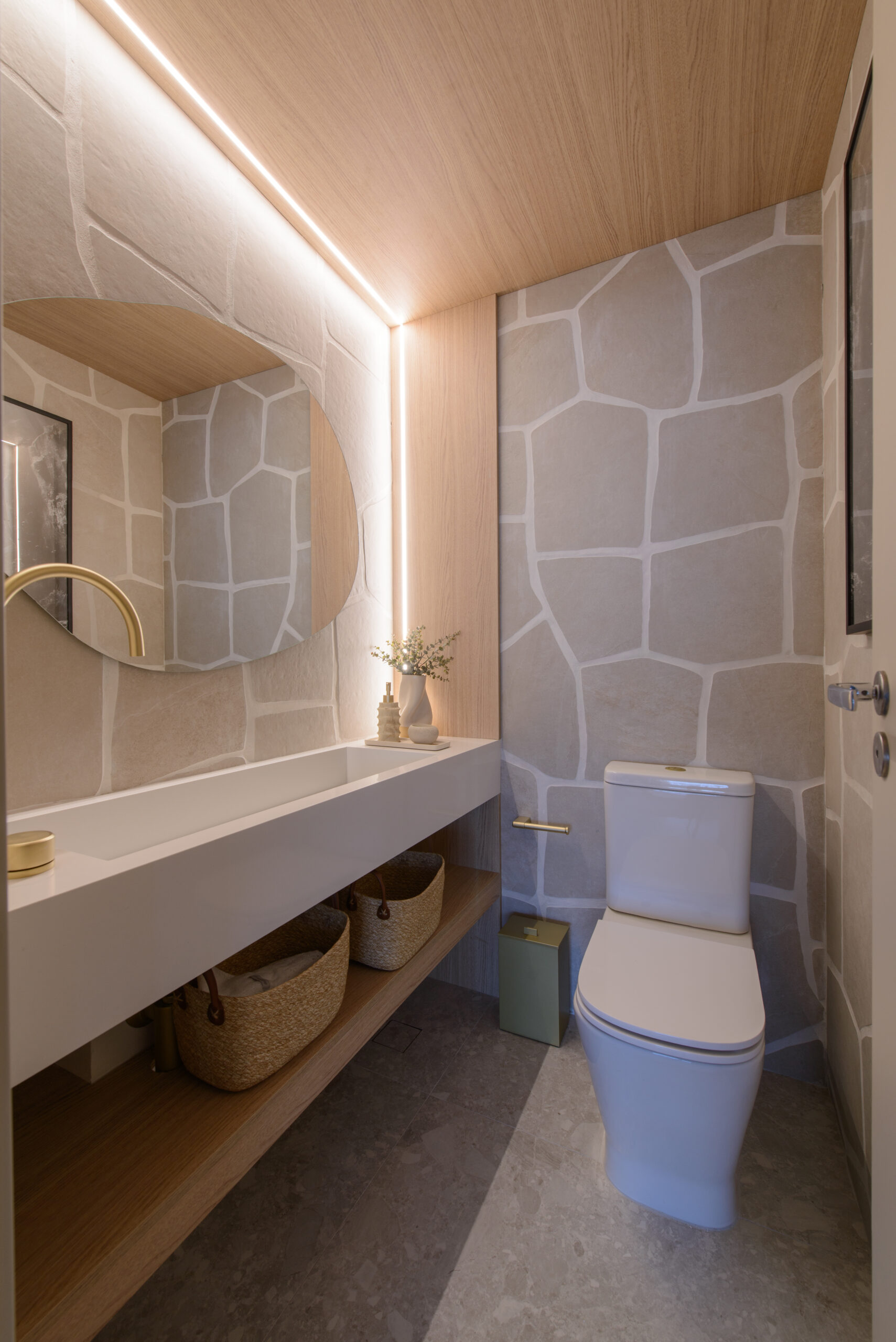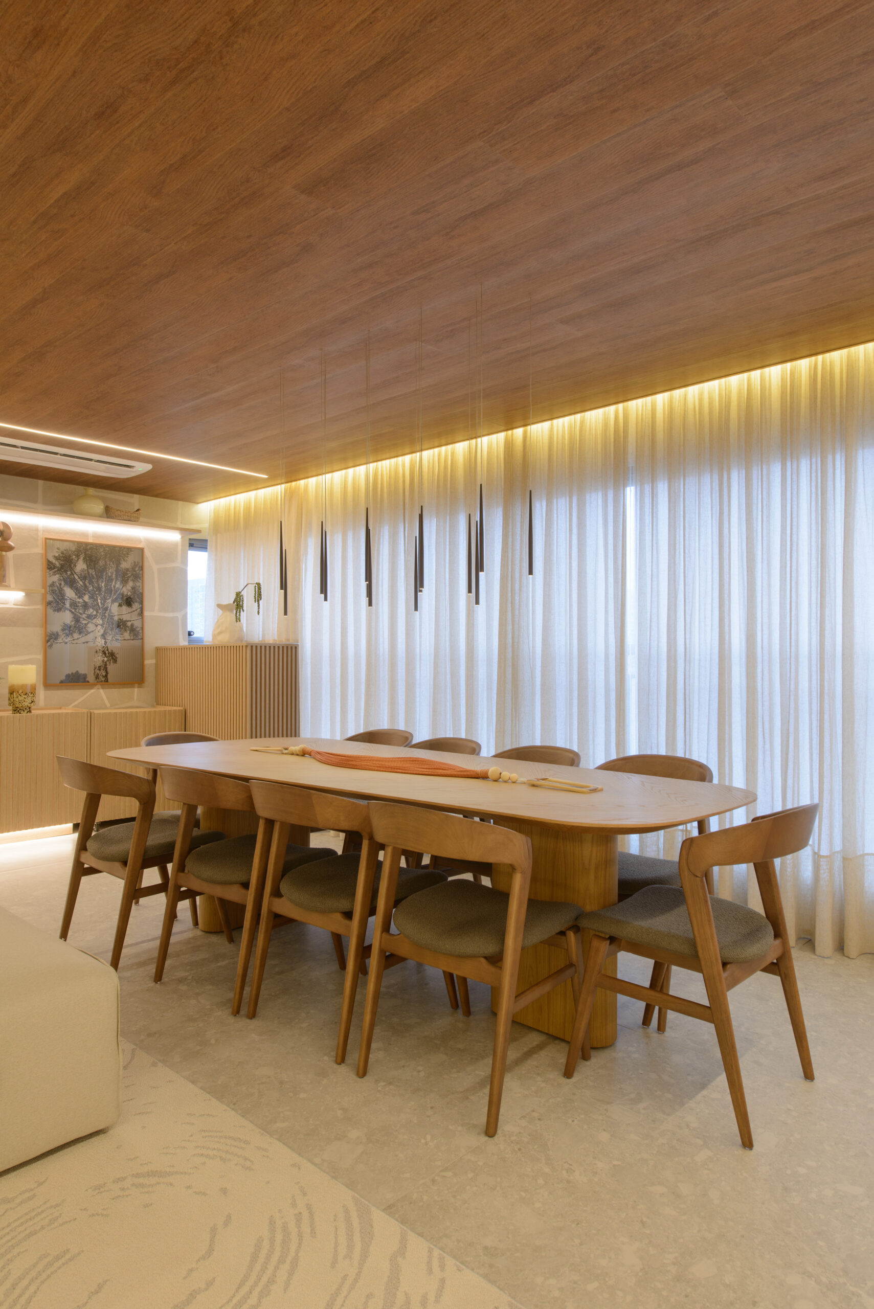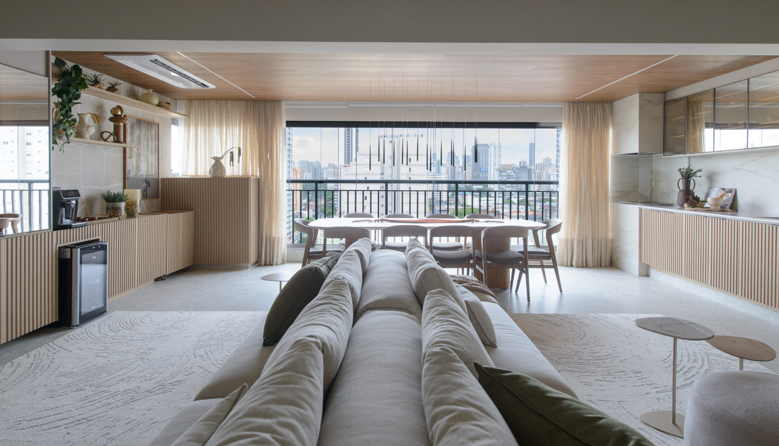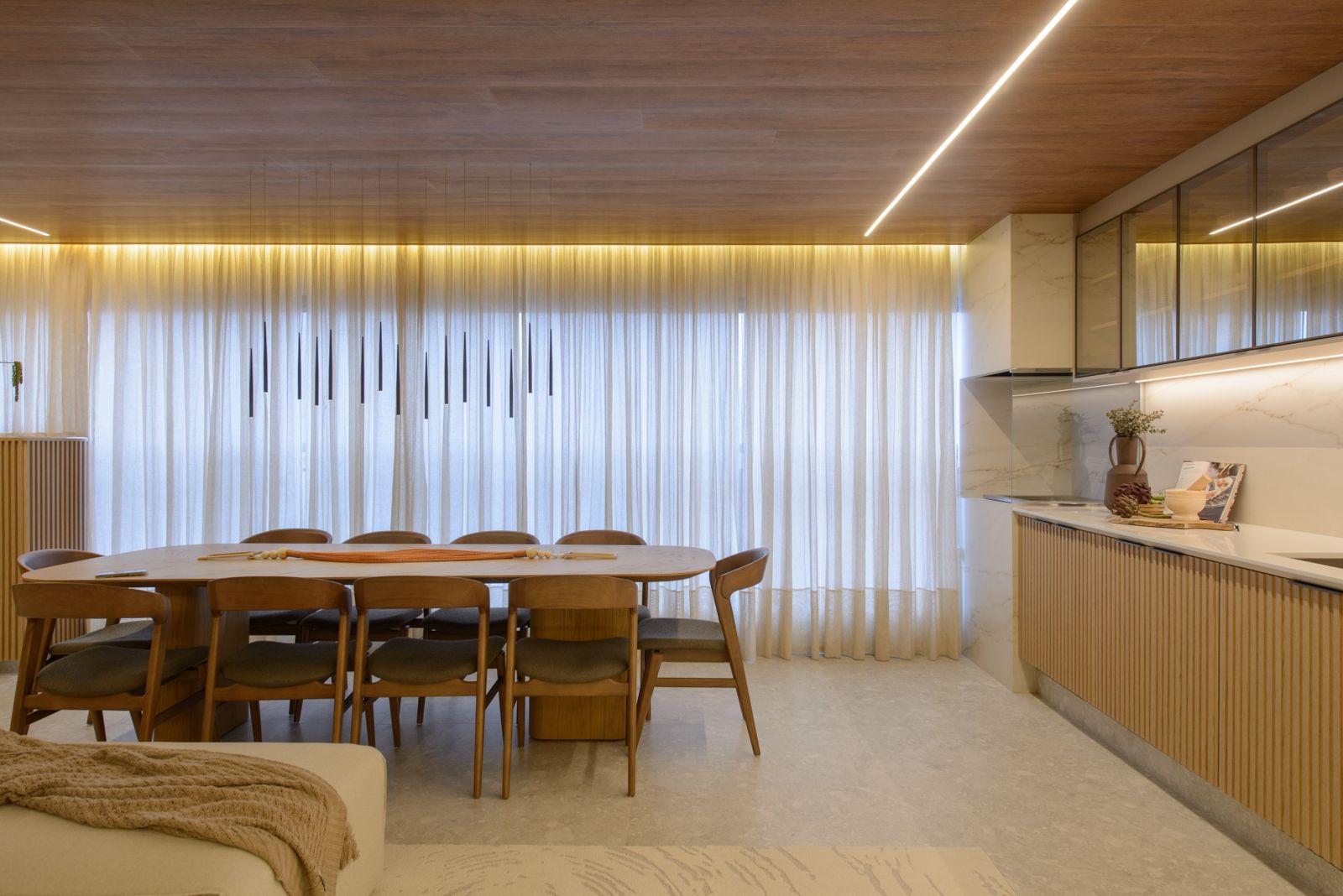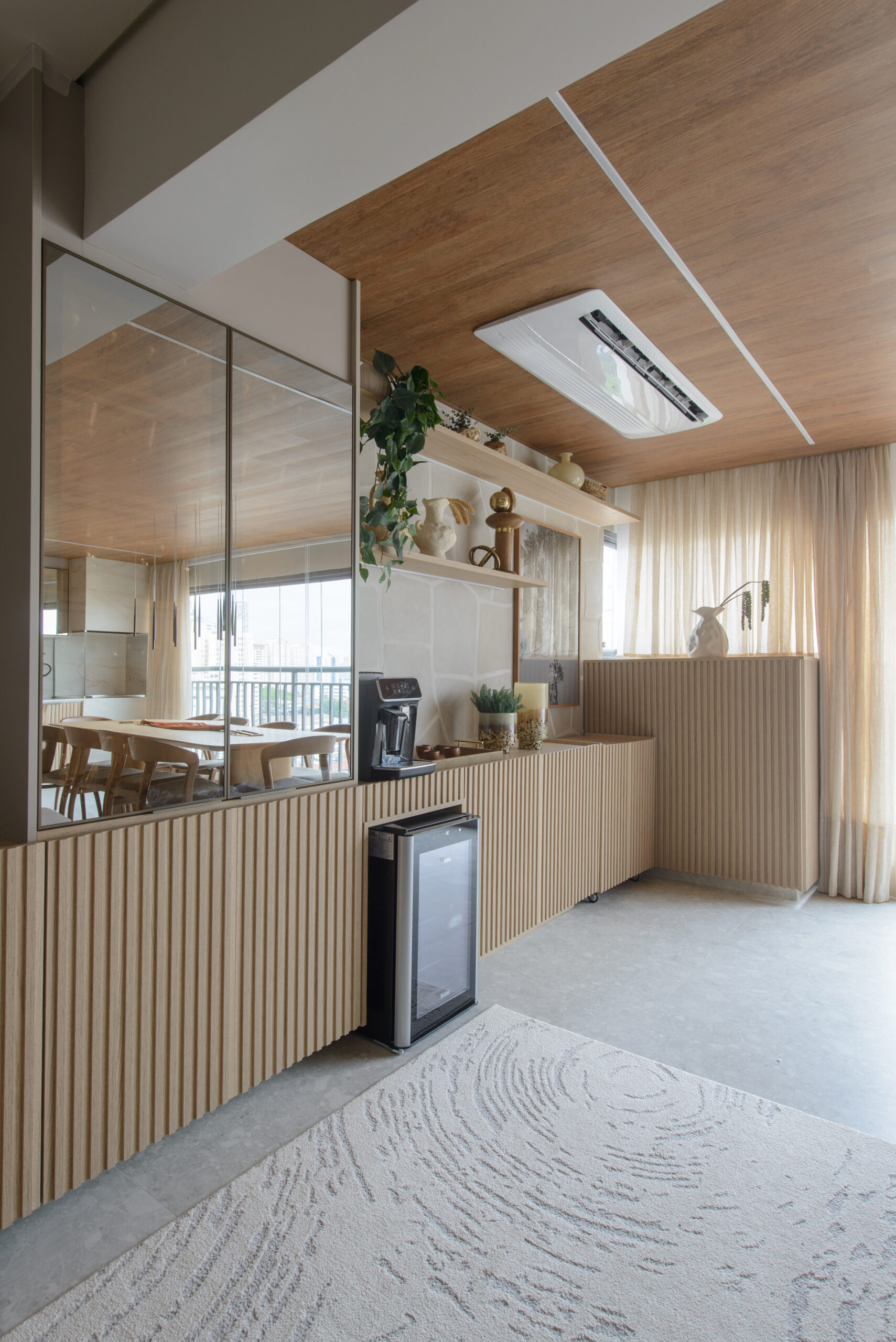Atendendo aos pedidos especiais da cliente, o fogão italiano se destaca na cozinha, que foi projetada como o coração da casa, refletindo o amor dela por cozinhar e receber. A decoração combinou elementos clássicos com um toque contemporâneo brasileiro, resultando em um apartamento elegante, onde o marmorizado e os toques dourados se misturam harmoniosamente com elementos amadeirados e revestimentos orgânicos, trazendo leveza para dentro do ambiente.
