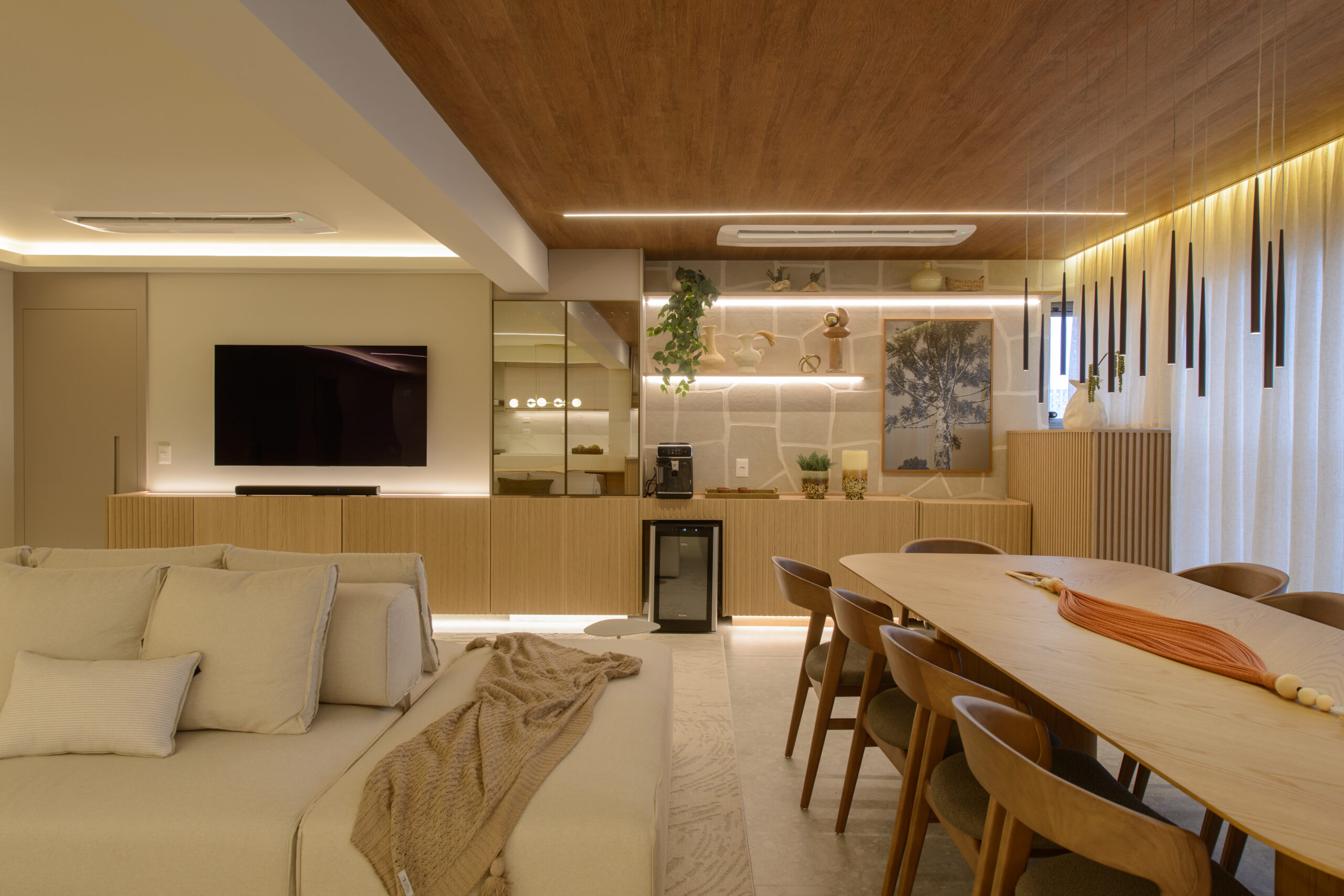 Além disso, o projeto foi pensado para proporcionar um ambiente acolhedor para receber a família, com um living ampliado ideal para encontros com netos e filhos, e espaço para desfrutar da paixão da família por churrascos. Cada quarto foi projetado para refletir a personalidade de seus ocupantes.