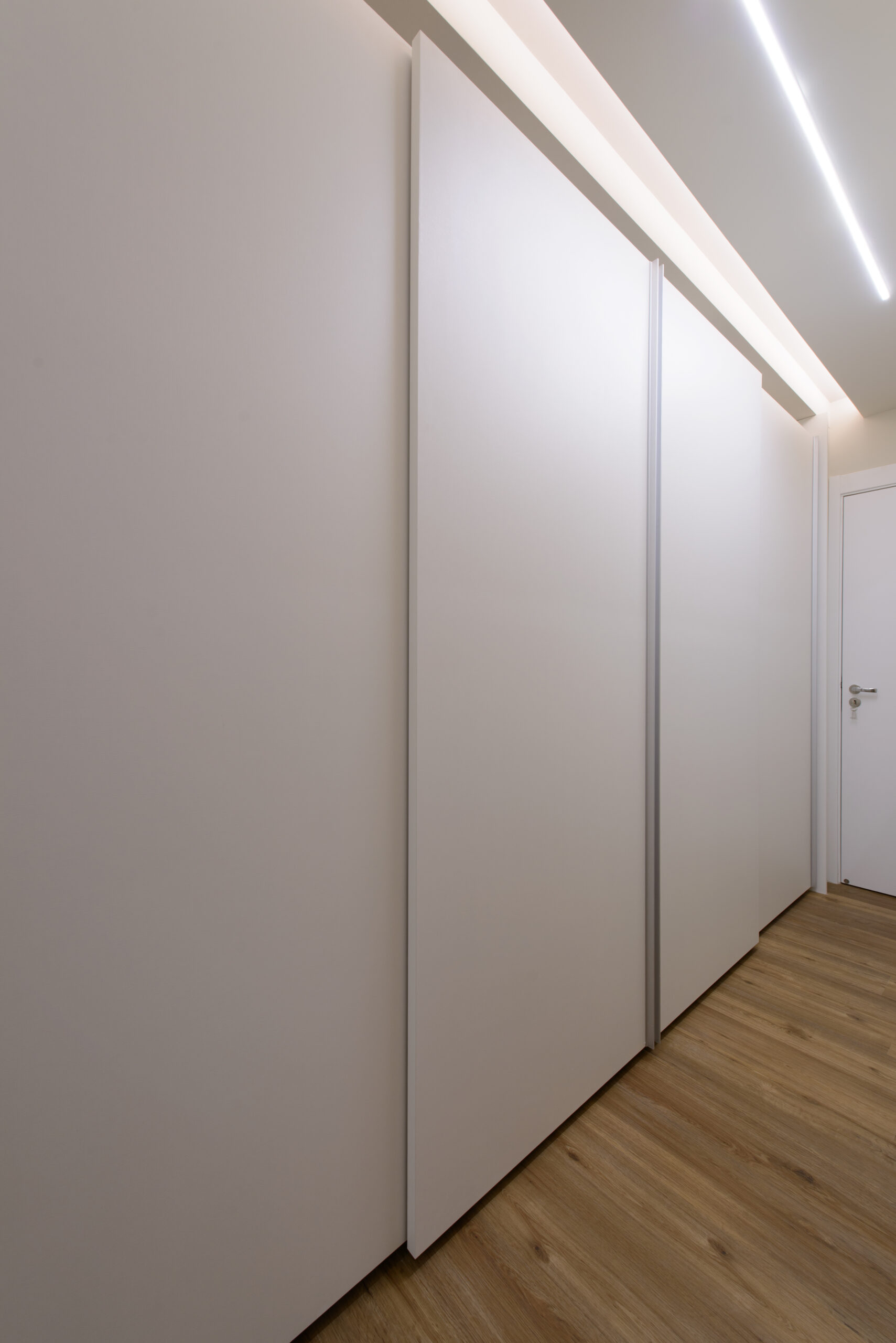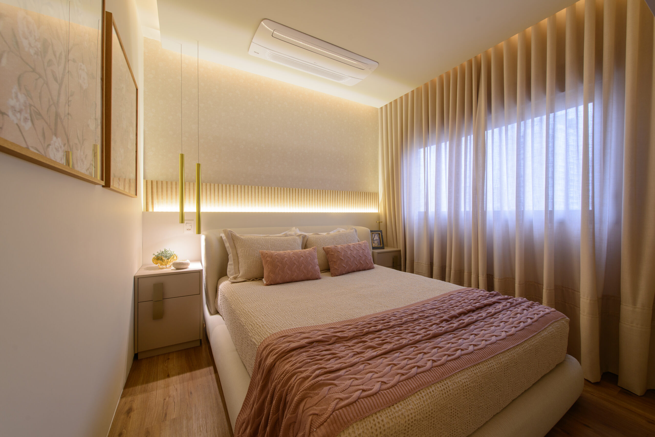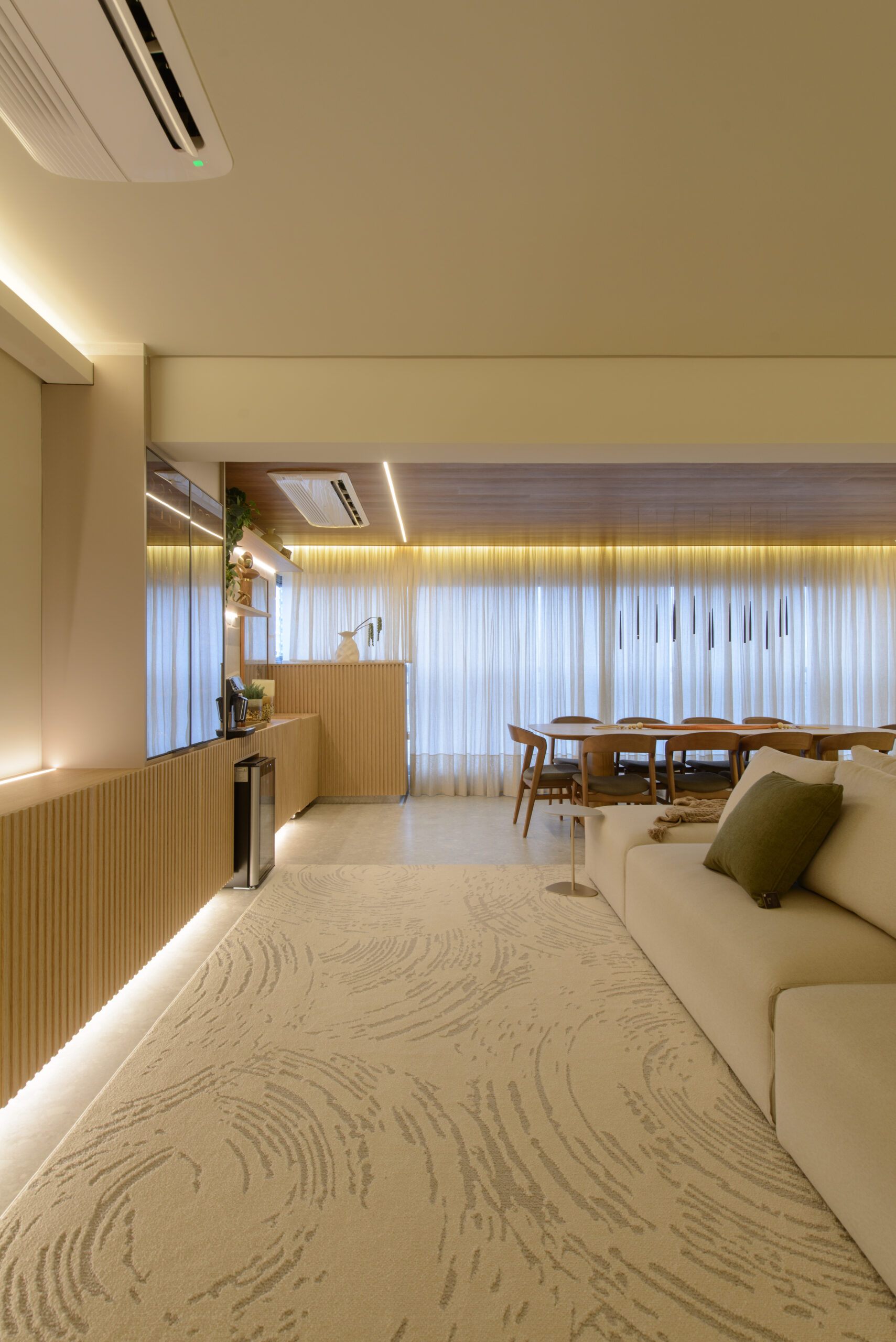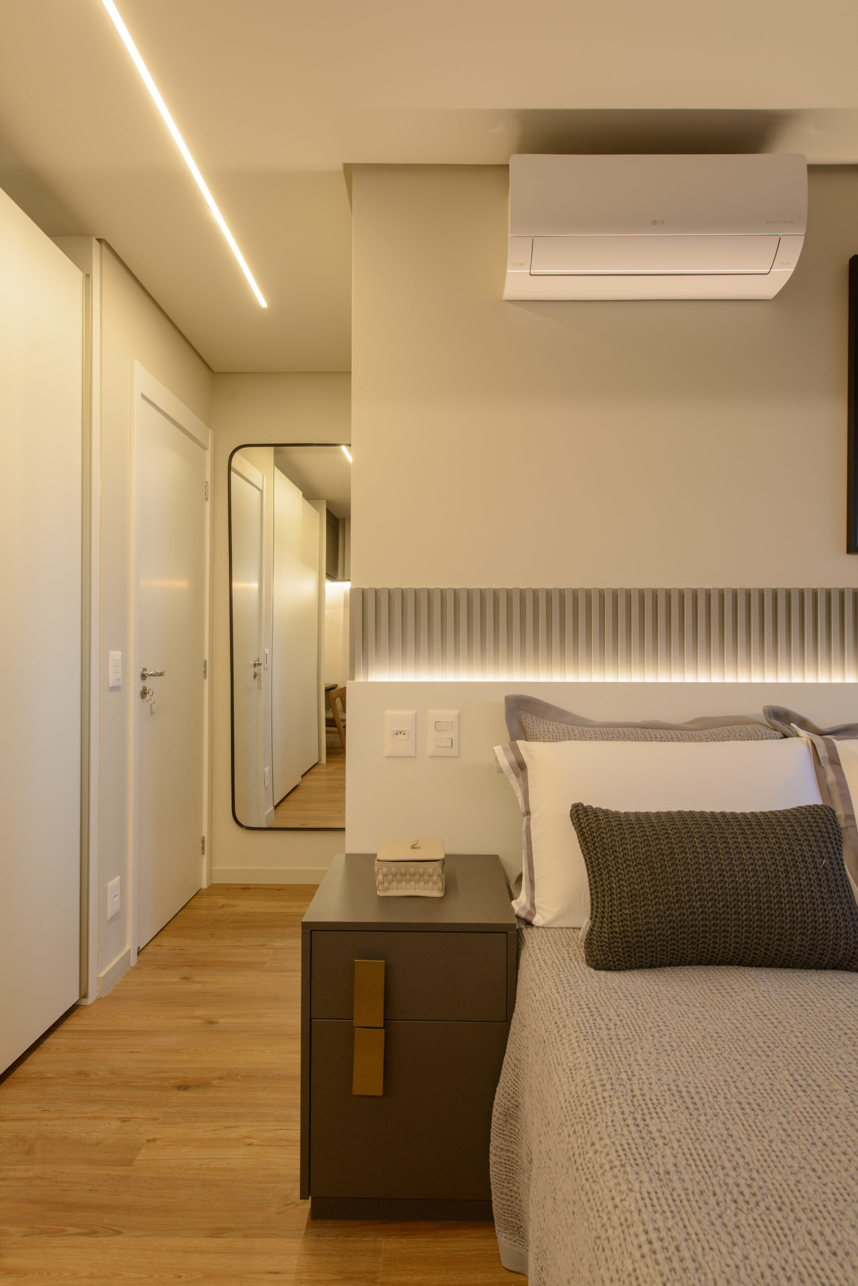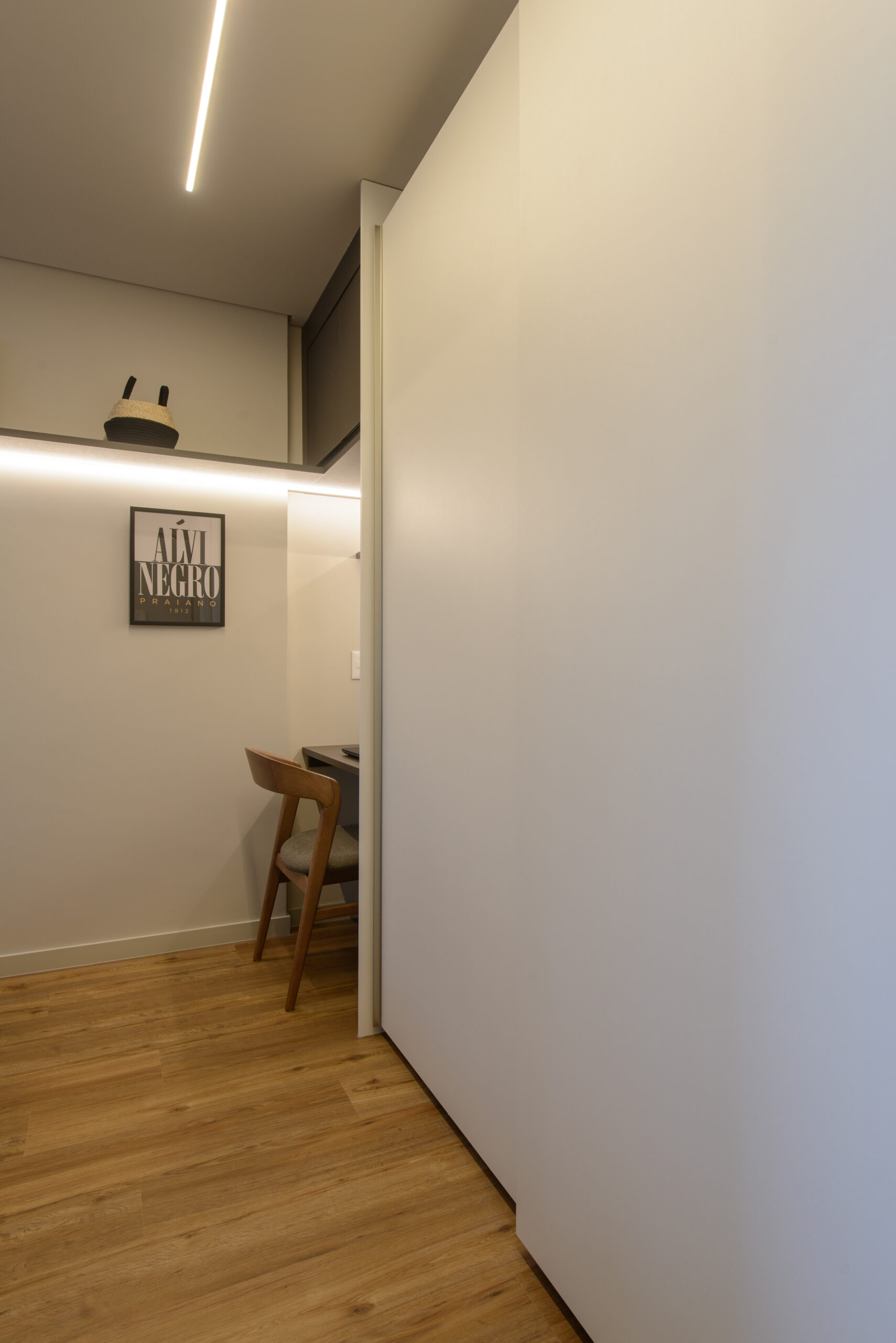 O projeto HL Tatuapé foi cuidadosamente planejado para atender às necessidades específicas de um casal de idosos, visando ser sua última moradia. Com foco em segurança e acessibilidade futura, foram implementadas soluções como iluminação indireta e balizada nos corredores, mobiliário sem quinas para evitar acidentes, e armários de fácil acesso na parte inferior.