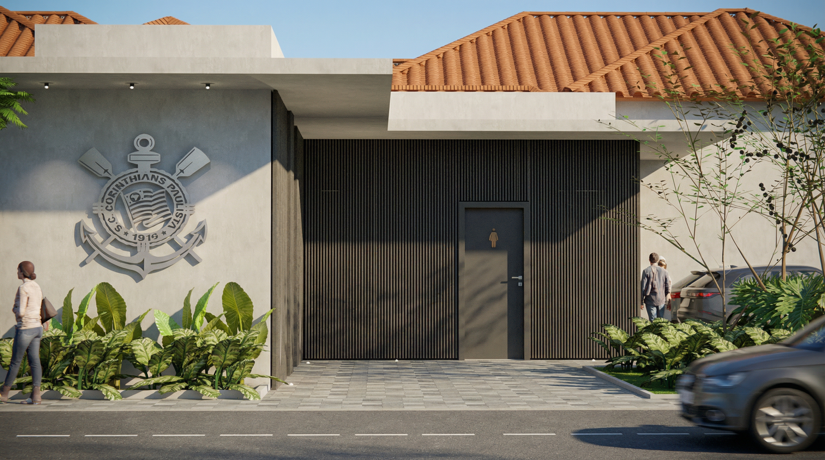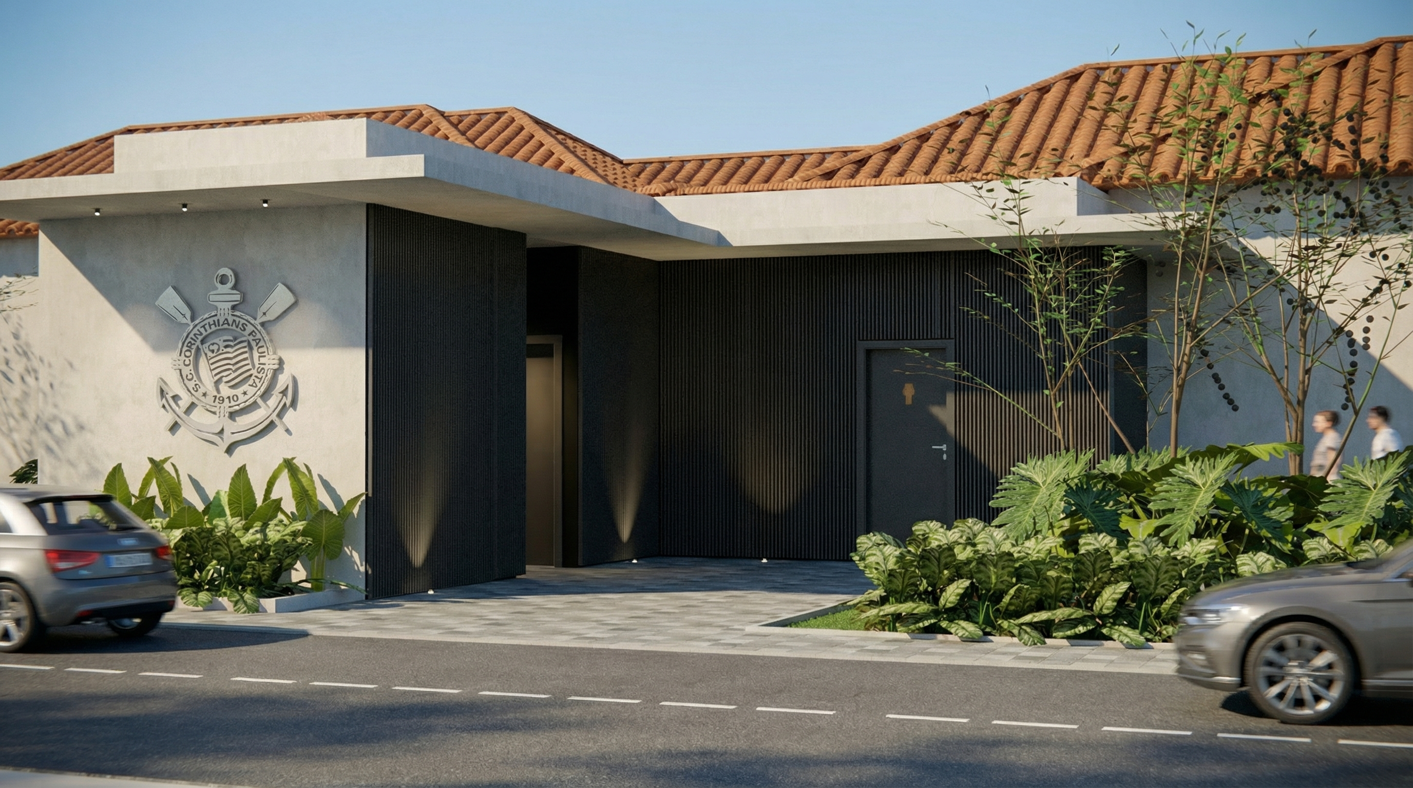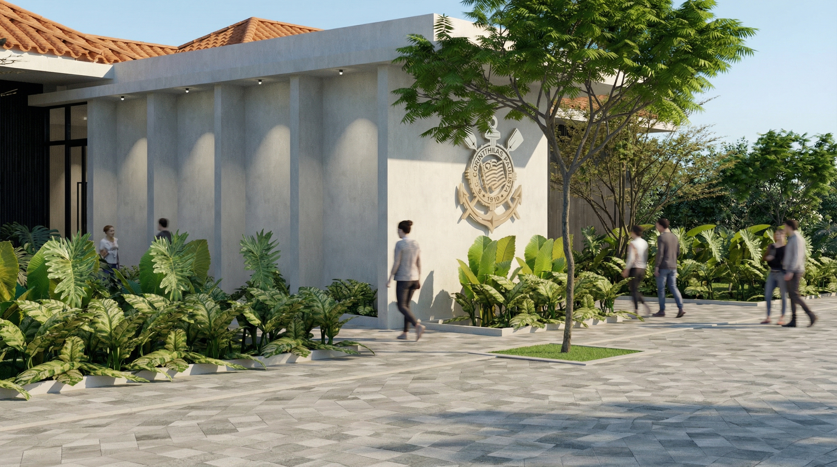 Optamos por um paisagismo com espécies nativas e pela incorporação sutil das cores institucionais, criando uma conexão com o universo do futebol sem recorrer a excessos.